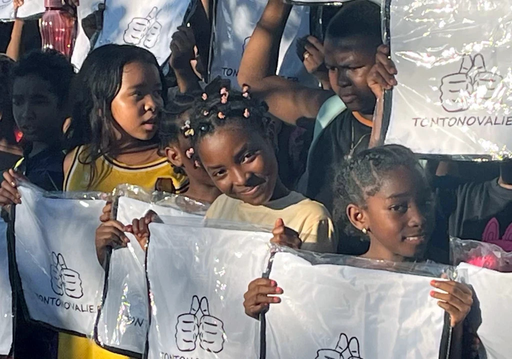 S’en est suivi la remise de vos dons : bracelets logotés ”Tonton Ovalie”, besaces scolaires logotés avec crayons, gourdes, vêtements d’enfants, porte-clés souvenir EDDY BEACH.
